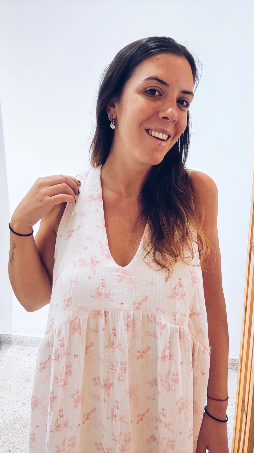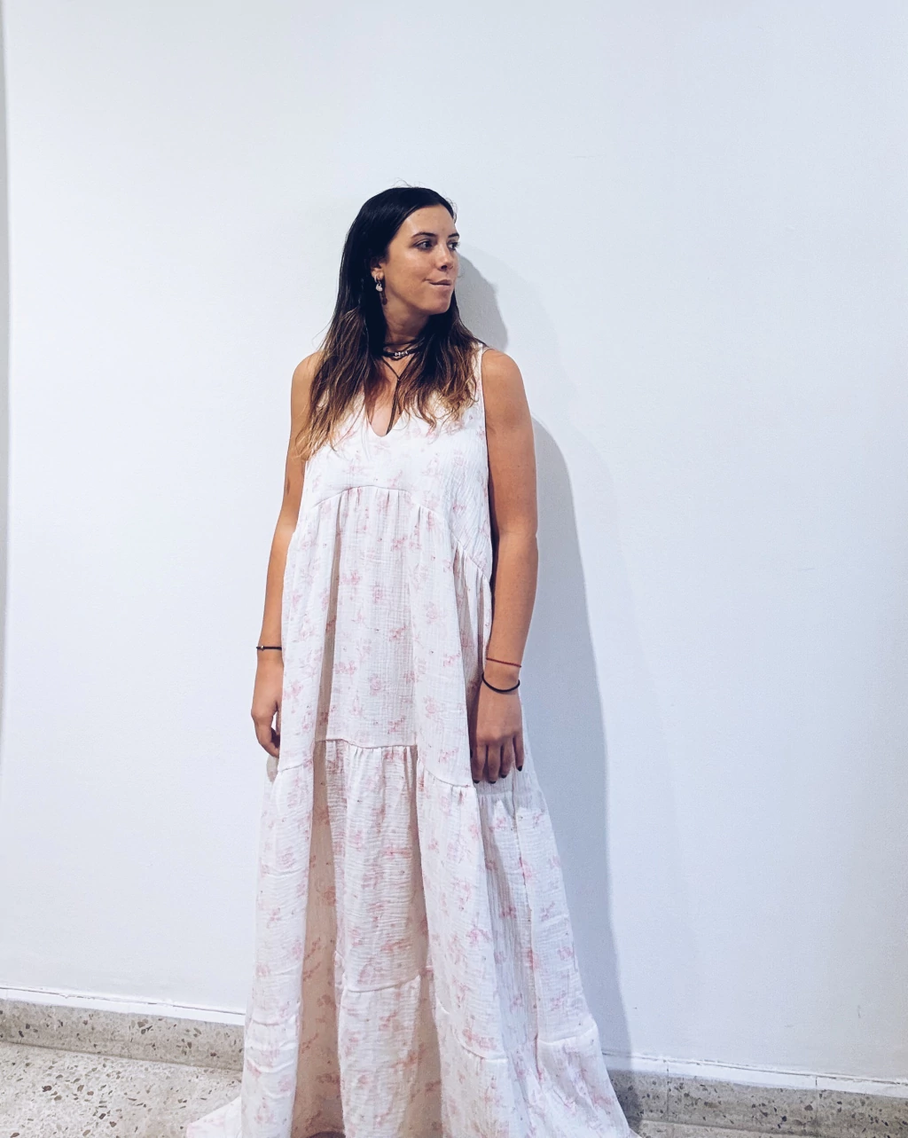 Vestido liso en gasa de algodon pre-lavada, posee tripe volado y pinzas en el busto generando entalle en el mismo. Escote en V. Talle de la modelo 1.